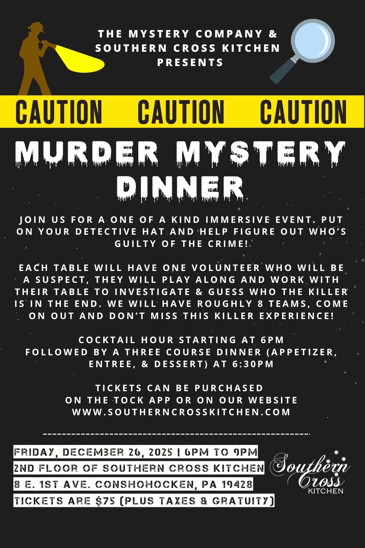 12/26 :: Murder Mystery Dinner December 26, 2025 06:00 PM until December 26, 2025 09:00 PM Menu Subject to Change Buy Your Ticket Here