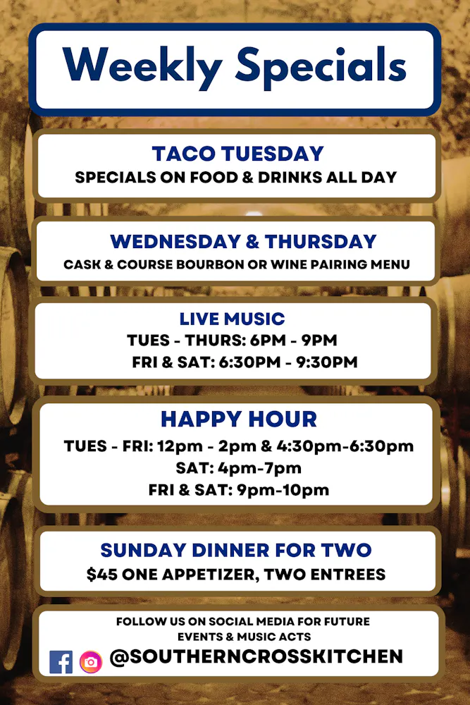 Tuesday, Wednesday & Thursday: 6 PM - 9 PM Friday & Saturday: 6:30 PM - 9:30 PM
